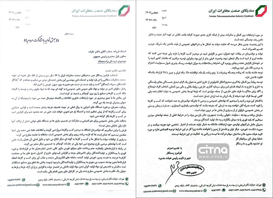 به گزارش سیتنا، فرامرز رستگار، دبیر و نایب رئیس هیات مدیره سندیکای صنعت مخابرات در نامه ای با موضوع درد دل و استمداد، خطاب به دکتر محمدرضا عارف، معاون اول رئیس جمهور آورده است: