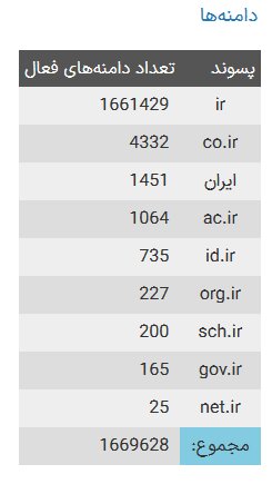 همچنین دامنههایی که بیشتر از ۱۰۰۰ مورد ثبتشده دارند، دامنه ایران با ۱۴۵۱ مورد و دامنه ac.ir با ۱۰۶۴ دامنه فعال هستند. البته دامنههای دیگری وجود دارند که کمتر از ۱۰۰۰ مورد به نام آنها ثبت شده است که می توان به دامنه id.ir با ۷۳۵ مورد، دامنه org.ir با ۲۲۷ مورد، دامنه sch.ir با ۲۰۰ مورد و دامنه gov.ir با ۱۶۵ مورد اشاره کرد. کمترین دامنه ثبتشده نیز متعلق به دامنه net.ir با ۲۵ دامنه فعال است و در مجموع تاکنون یک میلیون و ۶۶۹ هزار و ۶۲۸ دامنه ثبت شده اند.