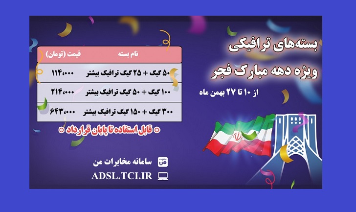 مشتریان برای خرید و استفاده از بستههای ترافیکی ویژه دهه فجر، میتوانند به پنل کاربری خود در adsl.tci.ir مراجعه و یا از طریق سامانه و اپلیکیشن «مخابرات من» به نشانی my.tci.ir اقدام کنند.