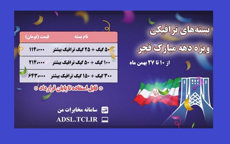 در آستانه دهه فجر شرکت مخابرات ایران بستههای ترافیکی با عنوان بستههای ویژه دهه فجر را به تمامی مشتریان سرویسهای اینترنت پرسرعت مخابرات شامل سرویسهای (ADSL)، سُرینو (VDSL) و تانوما (FTTH)، با پنجاه درصد حجم اضافه ارائه میکند.