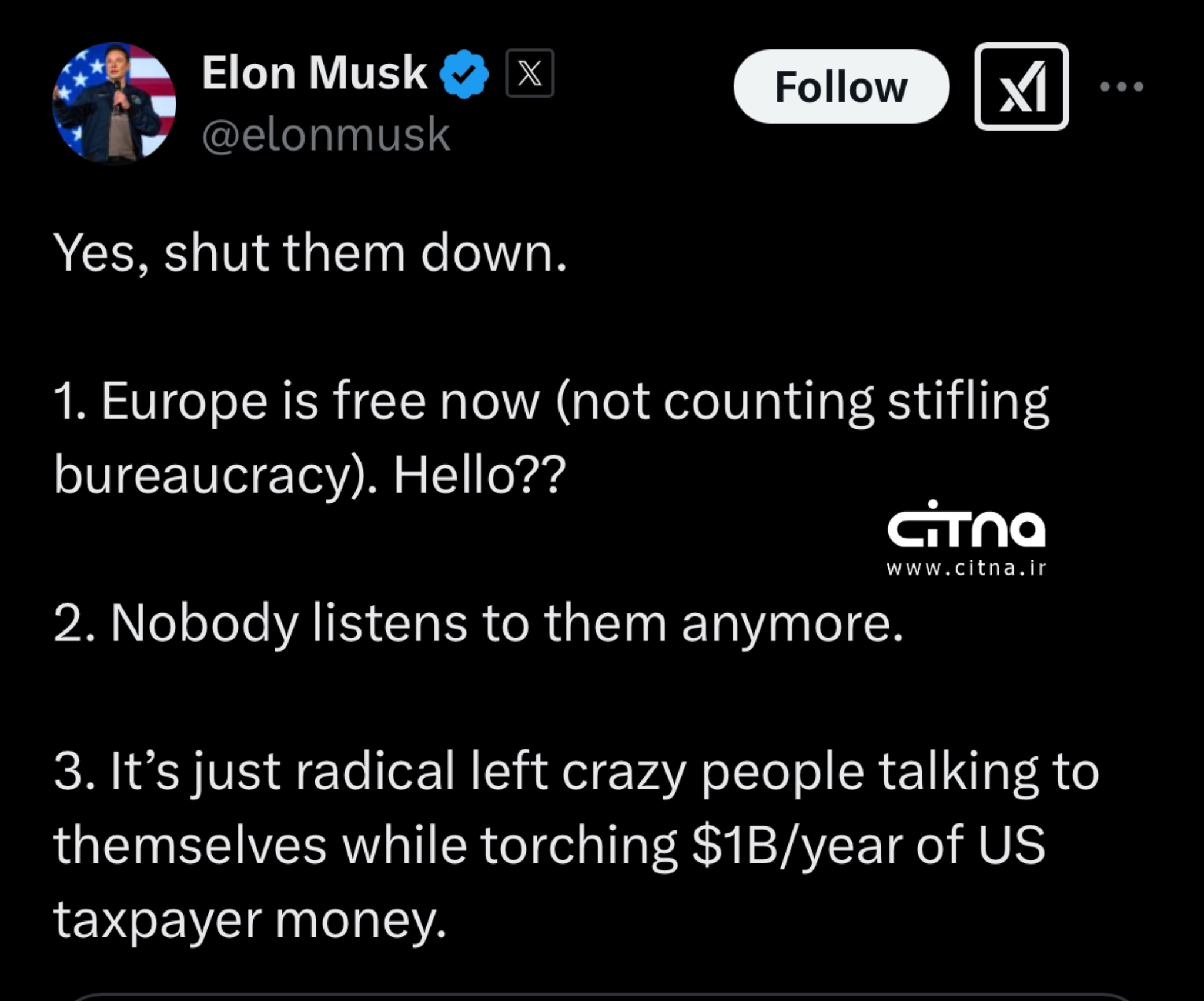 به گزارش سیتنا، ماسک که از سوی دونالد ترامپ حمایت میشود، در یک توئیت در شبکه ایکس نوشت که "اروپا اکنون آزاد است و "دیگر هیچکس به آنها گوش نمیدهد".