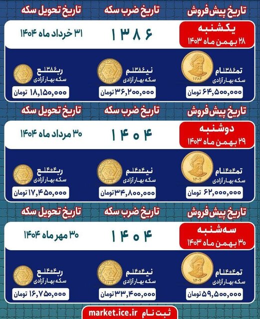 متقاضیان پیشفروش امروز برای خرید ربع سکه باید ۱۸ میلیون و ۱۵۰ هزار تومان، برای نیم سکه ۳۶ میلیون و ۲۰۰ هزار تومان و برای تمام سکه ۶۴ میلیون و ۵۰۰ هزار تومان پرداخت کنند.