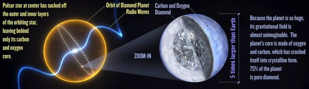 به گزارش سیتنا، «PSR J1719-1438b» احتمالاً یکی از خارقالعادهترین اجرام کیهانی است که میتوانید با آن مواجه شوید. این سیاره زمانی یک ستاره بود، اما تپاختر همراهش باعث شد به یک سیاره الماسی تبدیل شود: الماسی که 5 برابر زمین است. همچنین به دلیل همین الماسها جرم آن تقریباً مشابه سیاره مشتری شده. در ادامه به ویژگیهای این سیاره عجیب کیهانی و تپاختر آن میپردازیم.