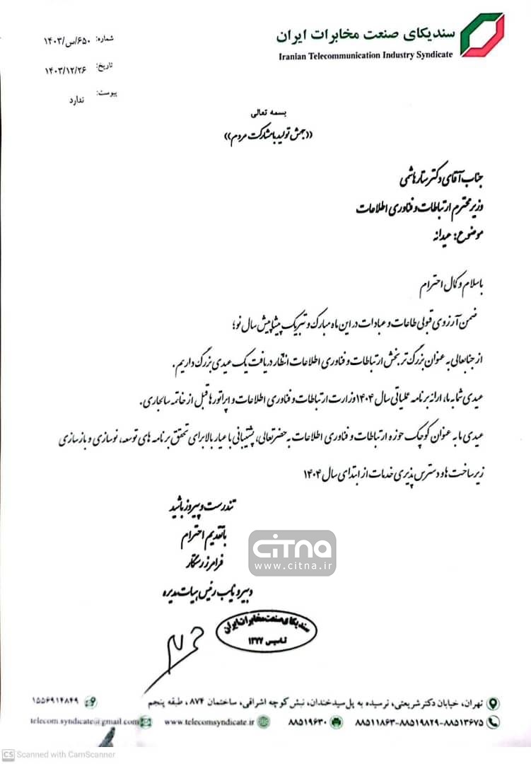 دبیر و نایب رئیس هیات مدیره سندیکای صنعت مخابرات ایران در نامه ای خطاب به وزیر ارتباطات تاکید کرد: عیدی شما به ما ارائه برنامه عملیاتی سال 1404 وزارت ارتباطات و فناوری اطلاعات و اپراتورها قبل از خاتمه سال جاری و عیدی ما به عنوان کوچک حوزه ارتباطات و فناوری اطلاعات به حضرتعالی، پشتیبانی با عیار بالا برای تحقق برنامه های توسعه، نوسازی و بازسازی زیرساخت ها و دسترس پذیری خدمات از ابتدای سال 1404.