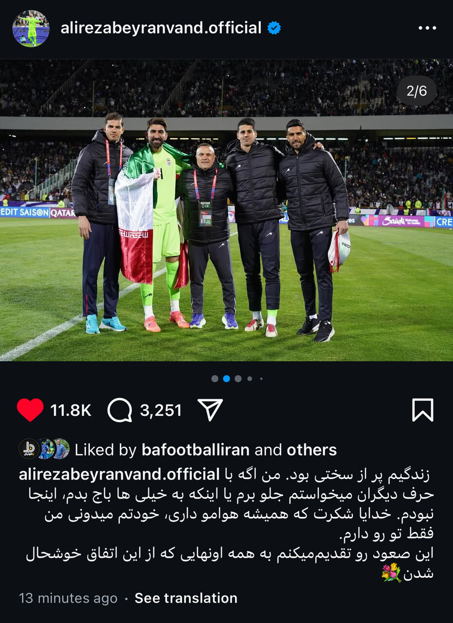 علیرضا بیرانوند پست جدیدی در صفحه اینستاگرامش منتشر کرد.