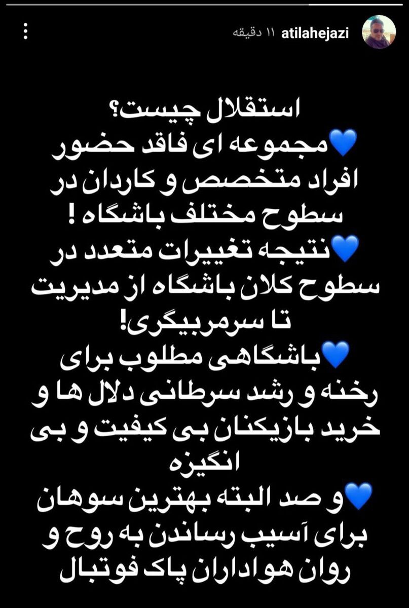 مربی اسبق استقلال که فرزند از اسطوره فقید باشگاه هم تلقی میشود، دقایقی پس از به صدا درآمدن سوت بازی استقلال در فضای مجازی نوشت: