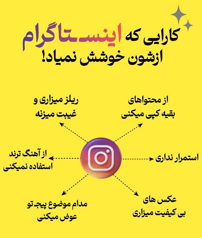 معماری محتوا (استراتژی محتوا): باید یه برنامه یا تقویم محتوایی داشته باشید. بدونید کی و چی میخواید منتشر کنید. تنوع رو حفظ کنید (هم پست، هم ریلز، هم استوری) تا مخاطب خسته نشه و پیجتون پویا بمونه. محتوای هدفمند بسازید.
