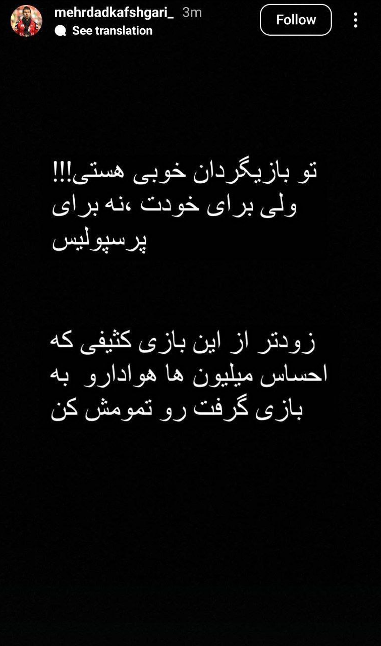 مهرداد کفشگری، بازیکن سابق پرسپولیس استوری جدیدی منتشر کرد.