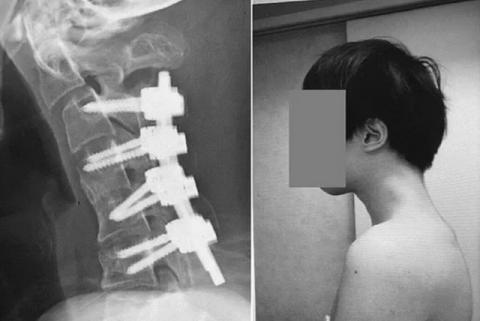 پزشکان گردن این جوان را جراحی کردند و با قرار دادن میلههای فلزی در استخوانهای گردن او، وضعیت گردنش را اصلاح کردند.