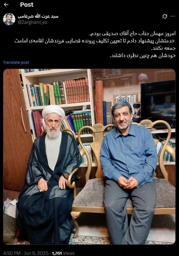 امروز مهمان جناب حاج آقای صدیقی بودم. خدمتشان پیشنهاد دادم تا تعیین تکلیف پرونده قضایی فرزندشان اقامهی امامت جمعه نکنند. خودشان هم چنین نظری داشتند.