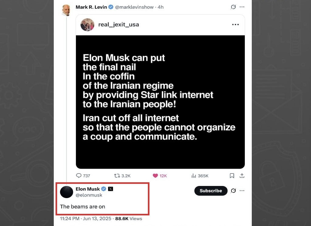 ایلان ماسک، در واکنش به پستی در شبکه ایکس پیرامون خدمات اینترنت ماهوارهای استارلینک در ایران، نوشت: «پرتوها فعالاند».