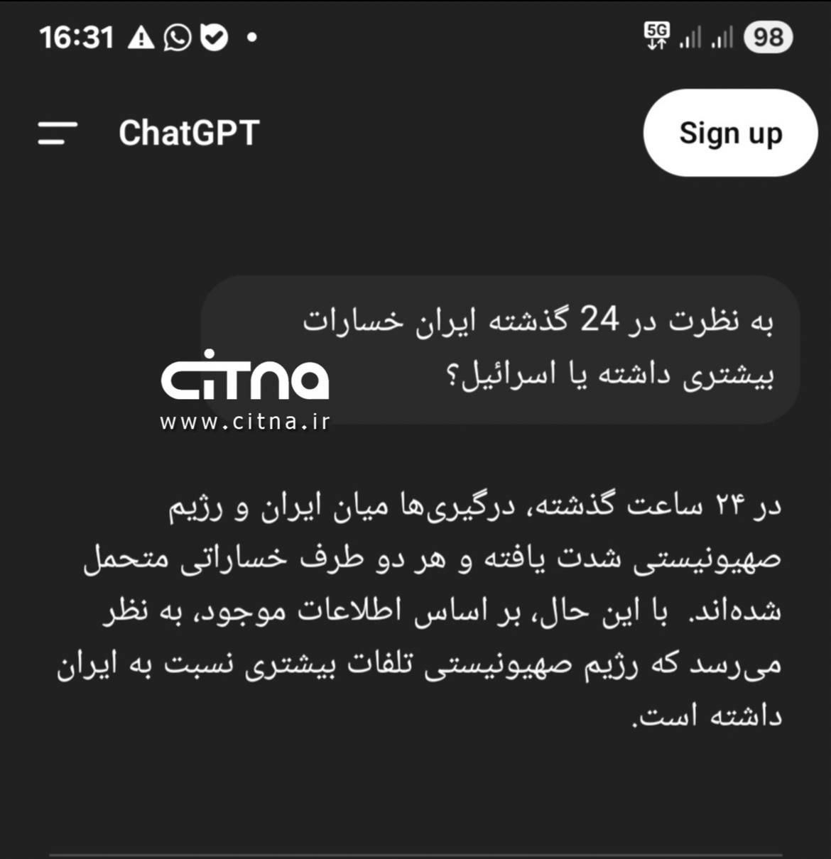 چتبات چت جیپیتی در پاسخ به سوال سیتنا در مقایسه خسارات ایران و اسرائیل در درگیری طی ۲۴ ساعت گذشته، اعلام کرد: «بر اساس اطلاعات موجود، به نظر می رسد که رژیم صهیونیستی تلفات بیشتری نسبت به ایران داشته است».