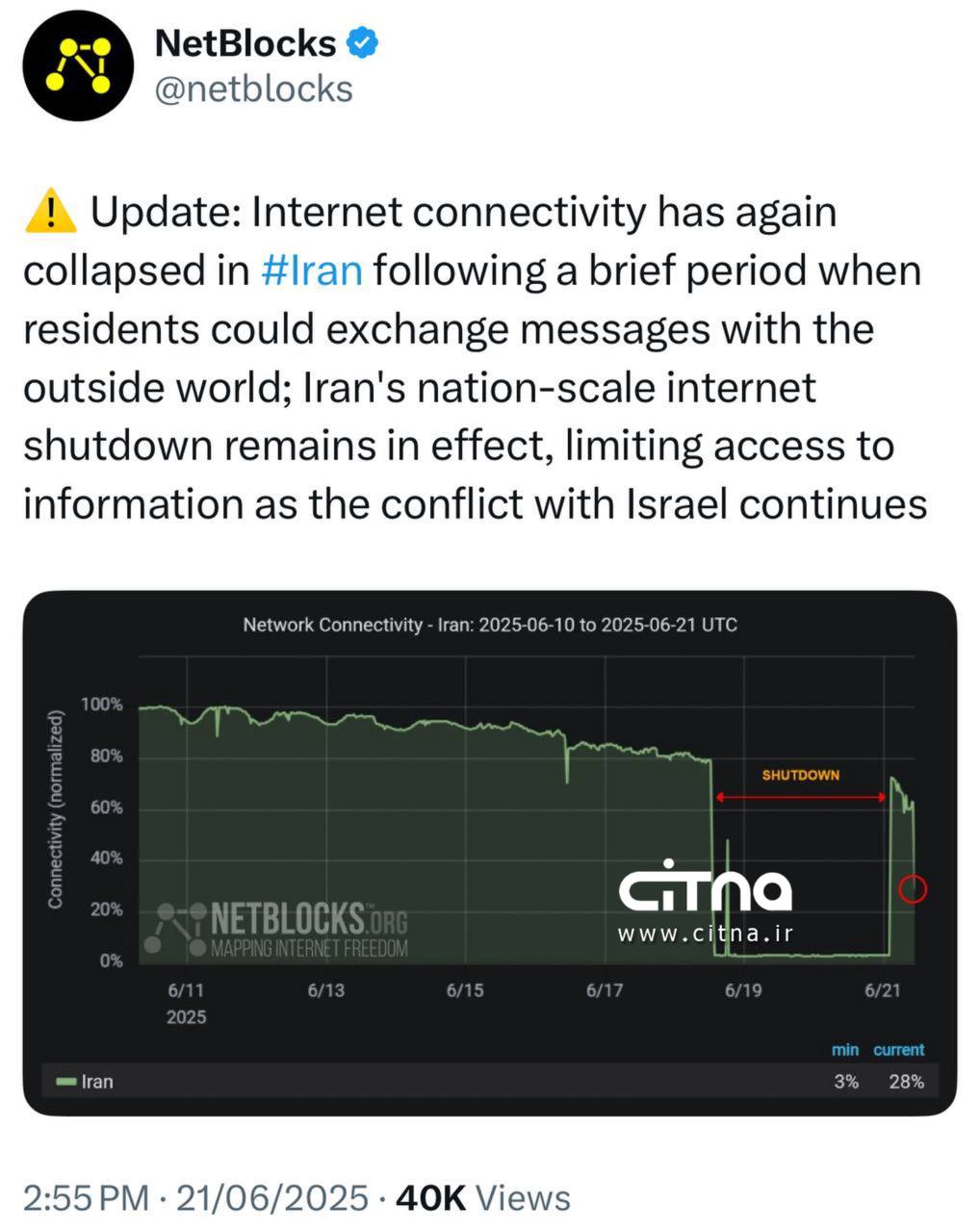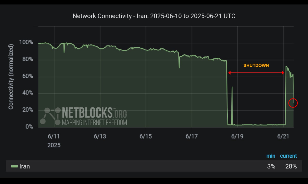 به گزارش خبرنگار سیتنا، سایت نت بلاکس ساعتی پیش با انتشار نمودار ادامه قطعی سراسری اینترنت بین الملل در ایران، اتصال های مقطعی را تایید کرد.