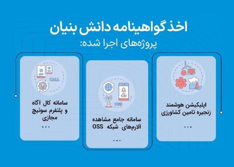 در ادامه مسیر نوآوری و توسعه فناوری های نوین، سه پروژه فناورانه شامل اپلیکیشن هوشمند زنجیره تأمین کشاورزی، سامانه جامع مشاهده آلارم های شبکه OSS و سامانه کال آگاه به همراه پلتفرم سوییچ مجازی موفق به کسب گواهی دانش بنیان شدند.