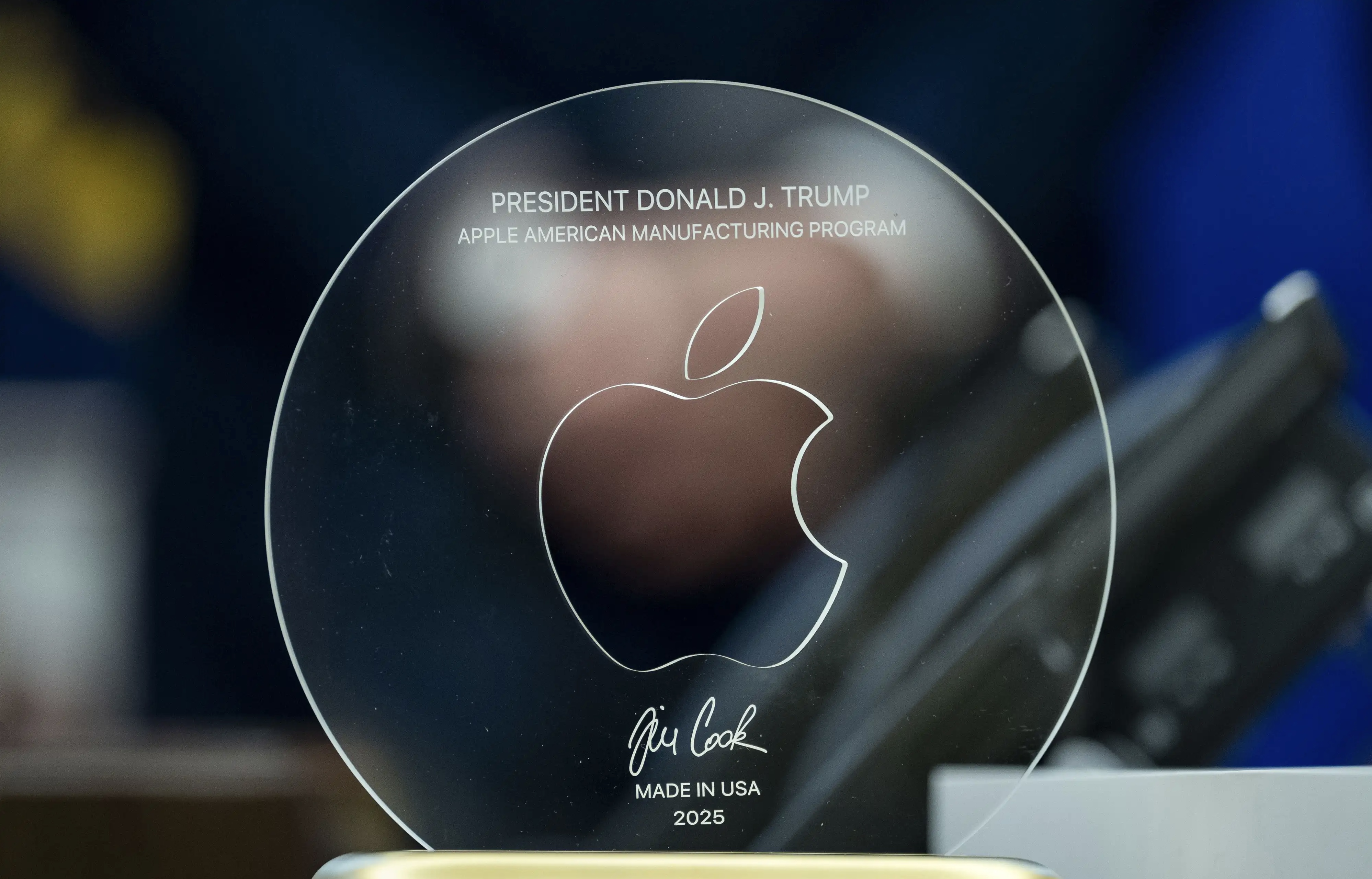 تیم کوک، مدیرعامل اپل در حاشیه نشست مطبوعاتی کاخ سفید که به منظور اعلام برنامه‌های جدید اپل برای تولید در خاک آمریکا برگزار شد، هدیه‌ای خاص به دونالد ترامپ، رئیس‌جمهوری آمریکا، اهدا کرد.