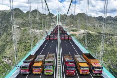 با عبور همزمان ۹۶ کامیون باری از روی پل معلق هواجیانگ، این سازه به عنوان مرتفع ترین پل جهان آزمایش باربری خود را با موفقیت پشت سر گذاشت.
