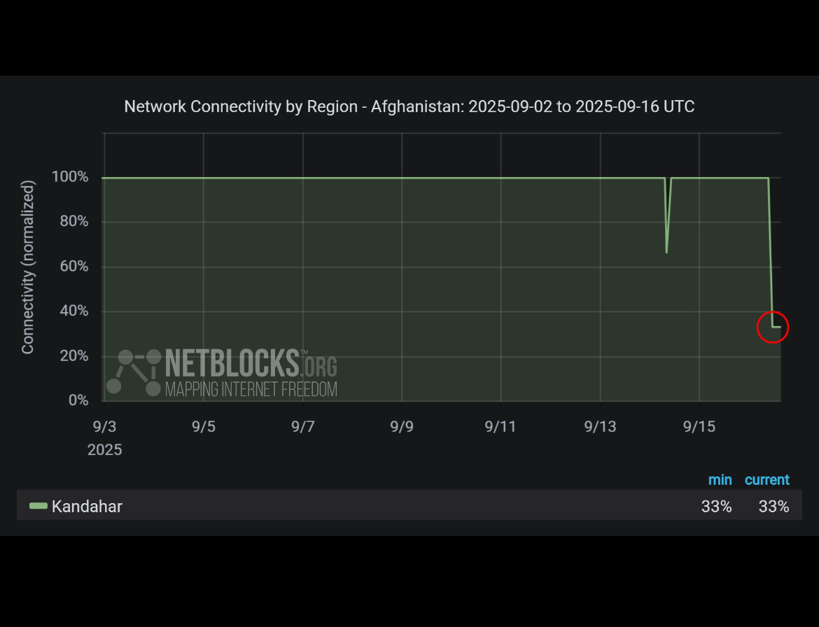 تأیید شد: داده‌های شبکه، اختلال جزئی در اتصال اینترنت در افغانستان را نشان می‌دهد که تأثیر زیادی بر مناطقی از جمله قندهار داشته است؛ این حادثه طبق اظهارات رهبری طالبان، اقدامی علیه فعالیت‌های «غیراخلاقی» تلقی می‌شود.