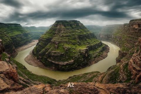 اینجا، جایی است که رودخانه خروشان سیمره با پیچوخمی حیرتانگیز، مسیری نعلشکل را در دل صخرههای استوار باز و منظرهای را خلق کرده که بسیاری آن را با «پیچ نعل اسبی» گرند کنیون آمریکا مقایسه میکنند. لایههای زمینشناسی که همچون تاریخ مصور زمین بر دیوارههای دره نقش بستهاند، همراه با پوشش گیاهی سبزرنگی که در فصل بهار مخملی بر تن سنگها میکشد، عظمتی وصفناپذیر به این منظره بخشیده است.