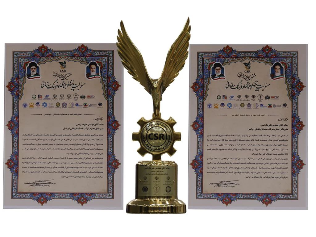 بدینوسیله بر اساس ارزیابیهای صورت گرفته از سوی کمیته علمی اجلاس، با اعطای این اعتبارنامه در هشتمین اجلاس سراسری مسئولیتپذیری اجتماعی و فرهنگ سازمانی با رویکرد اعطای نشان تعهد به مسئولیت اجتماعی از فعالیتهای ارزنده آن مجموعه محترم در حوزه مسئولیت انسانی – اجتماعی و تعهد به محیط زیست(برند سبز) قدردانی نموده و توفیقات روزافزون شما را در خدمتگزاری به مردم سرافراز این مرز و بوم، از درگاه ایزد منان، مسئلت مینماییم.