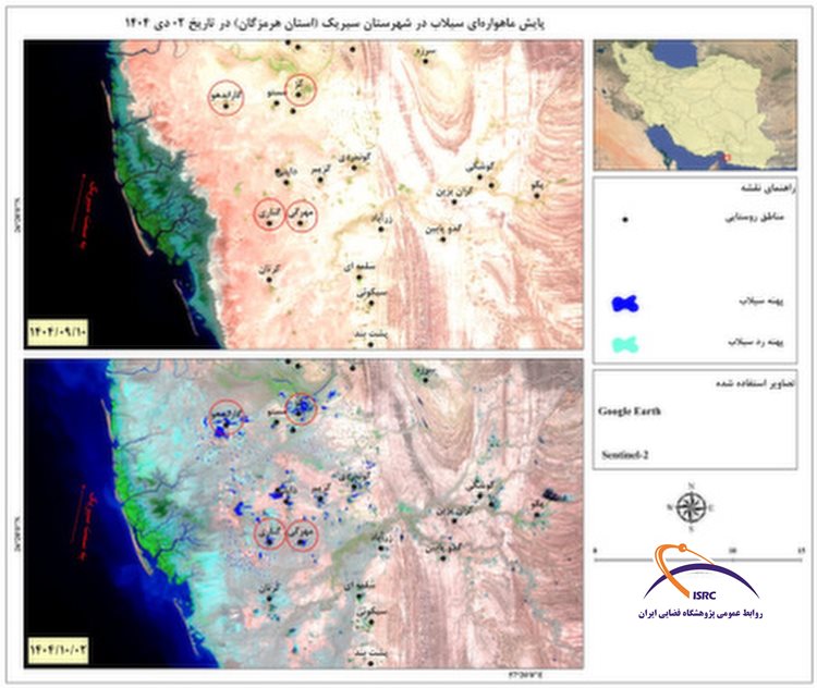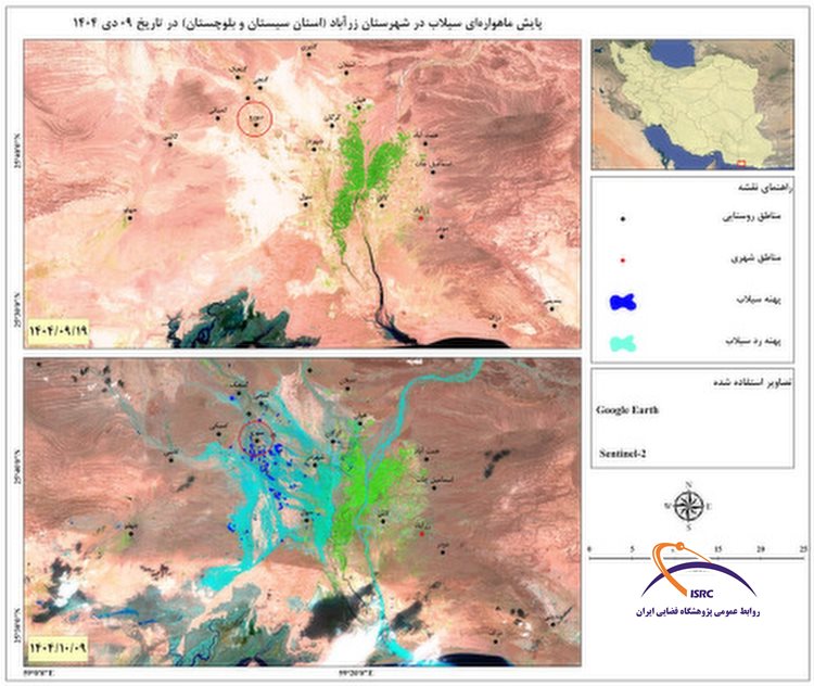 در پی بارش‌های سیل‌آسای آذرماه ۱۴۰۴ در استان‌های جنوبی کشور، مرکز تحقیقات پژوهشگاه فضایی ایران با بهره‌گیری از تصاویر ماهواره‌ای و فناوری‌های پیشرفته سنجش از دور، اقدام به پایش گسترده مناطق سیل‌زده و ارزیابی میزان آب‌گرفتگی‌ها و خسارات احتمالی نمود. این پایش با هدف شناسایی دقیق پهنه‌های آب‌گرفته، مناطق در معرض خطر، محدوده‌های خسارت‌دیده و ارائه اطلاعات بهنگام و کاربردی به دستگاه‌های مسئول مدیریت بحران انجام شد.