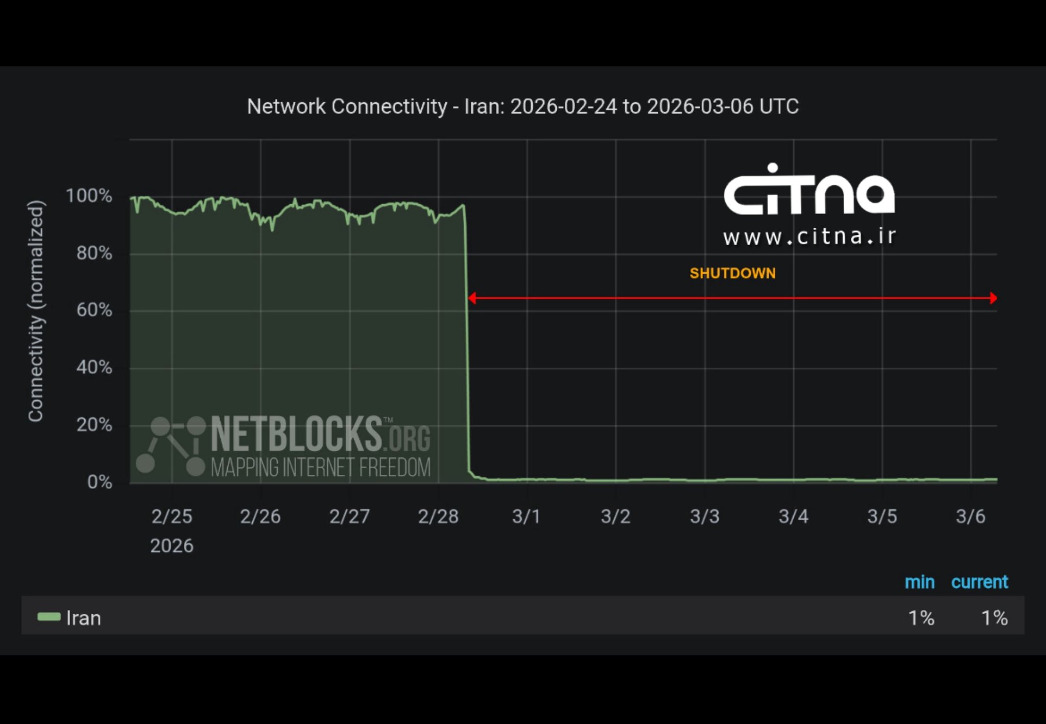 نت بلاکس اعلام کرد که دادههای منتشرشده نشان میدهد ایران پس از شش روز قطعی اینترنت همچنان در «تاریکی دیجیتال» قرار دارد و سطح اتصال به اینترنت جهانی تنها حدود یک درصد است؛ در حالی که تنها اتصال به شبکهها و سایت های داخلی میسر است.