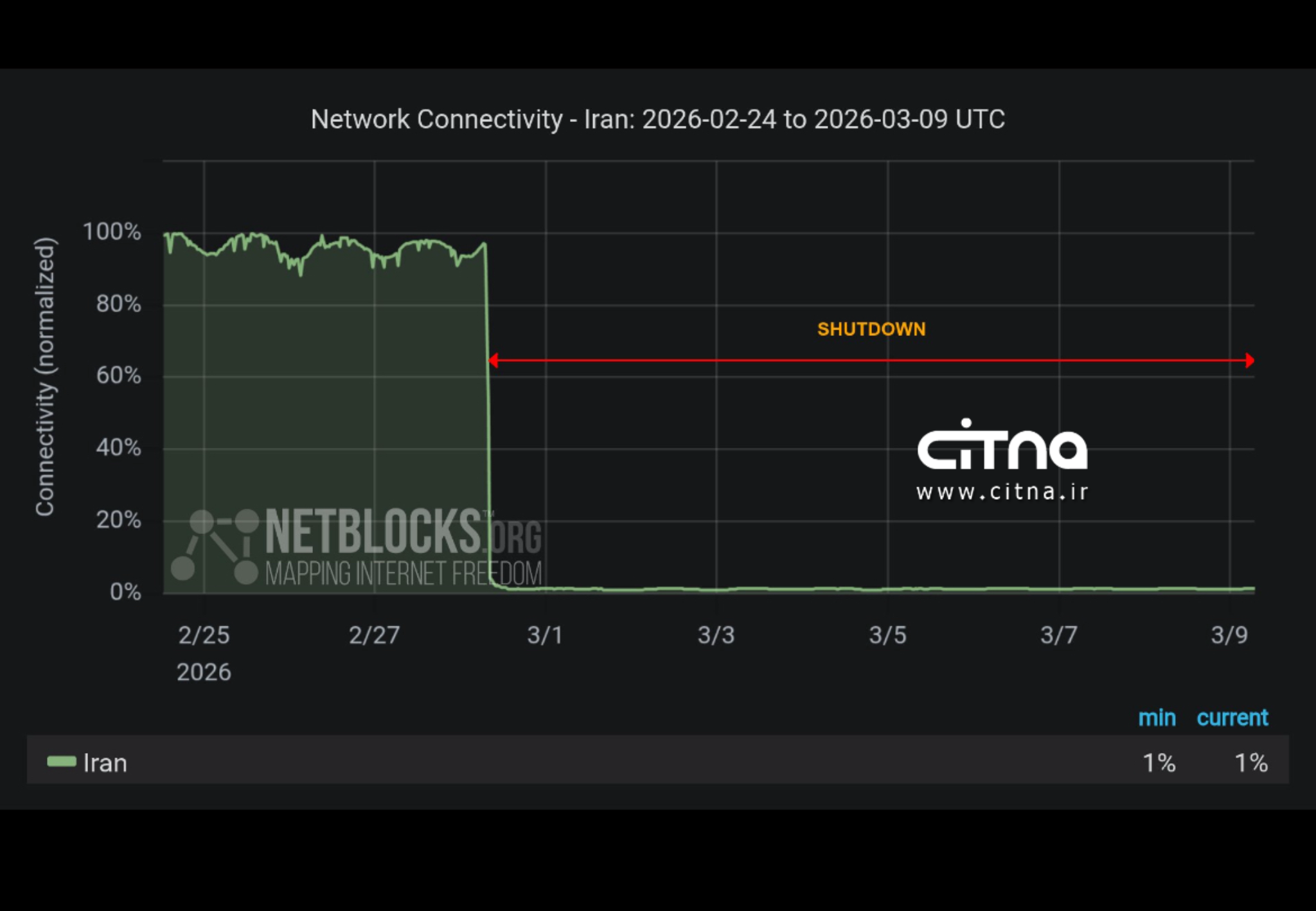 به گزارش سیتنا و بر اساس اعلام نتبلاکس، پس از گذشت ۲۱۶ ساعت از آغاز این محدودیتها، میزان دسترسی به اینترنت در ایران تنها حدود یک درصد از سطح عادی برآورد میشود.