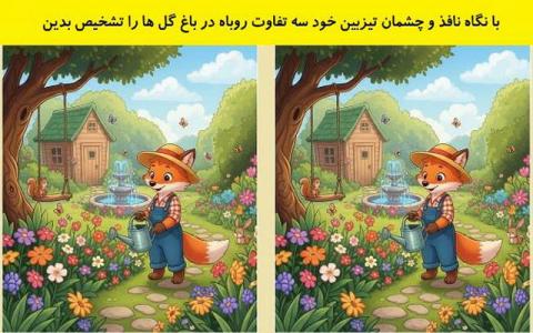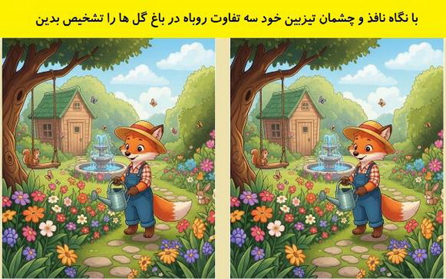 در آزمون تفاوت تصویری روباه باغبان شما باید سه تفاوت دو تصویر کنار هم را در هشت ثانیه تشخیص دهید، در عکس بزرگ و با کیفیت تفاوت تصویری روباه باغبان را ببینید و سپس بینایی و دقت خود را محک بزنید.