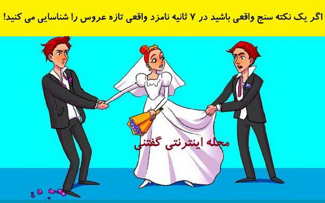 آیا توانستید بفهمید چه مردی نامزد واقعی عروس است؟ غلبه بر ماموریت امروز آنقدرها هم آسان نبوده، اما غیرممکن هم نیست، فقط باید به تخیل خود اجازه می دادید و سرنخ ها را دنبال کنید. اگر این چالش را دوست داشتید، از اشتراک گذاری آن در شبکه های اجتماعی خود دریغ نکنید. اگر پاسخ خود را پیدا نکردید، 5 ثانیه دیگر فرصت دارید.