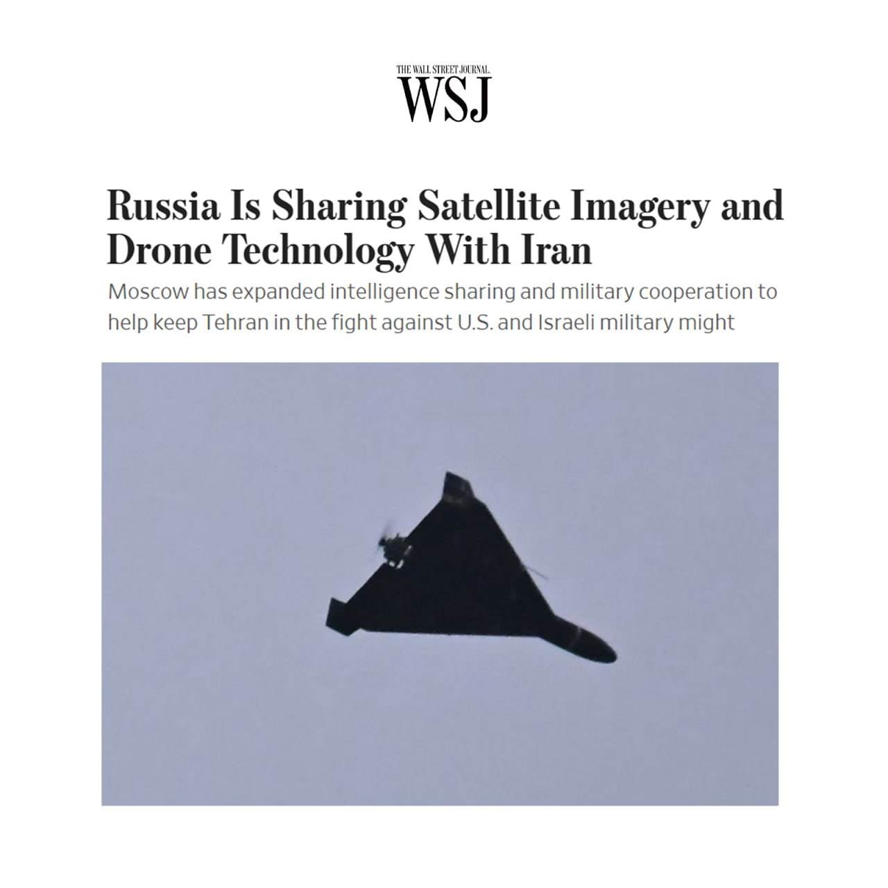 به اذعان وال استریت ژورنال، روسیه همکاری اطلاعاتی و نظامی خود با ایران را افزایش داده و تصاویر ماهواره‌ای و فناوری‌های مرتبط با پهپاد را در درگیری نظامی با آمریکا و اسرائیل در اختیار این کشور قرار داده است.