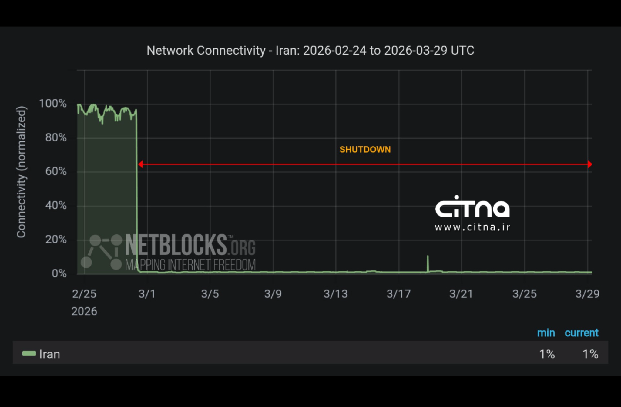 بر اساس اعلام نتبلاکس، قطع سراسری اینترنت در ایران پس از ۶۹۶ ساعت همچنان ادامه دارد و سطح دسترسی به شبکه جهانی به تنها یک درصد حالت عادی رسیده است.
