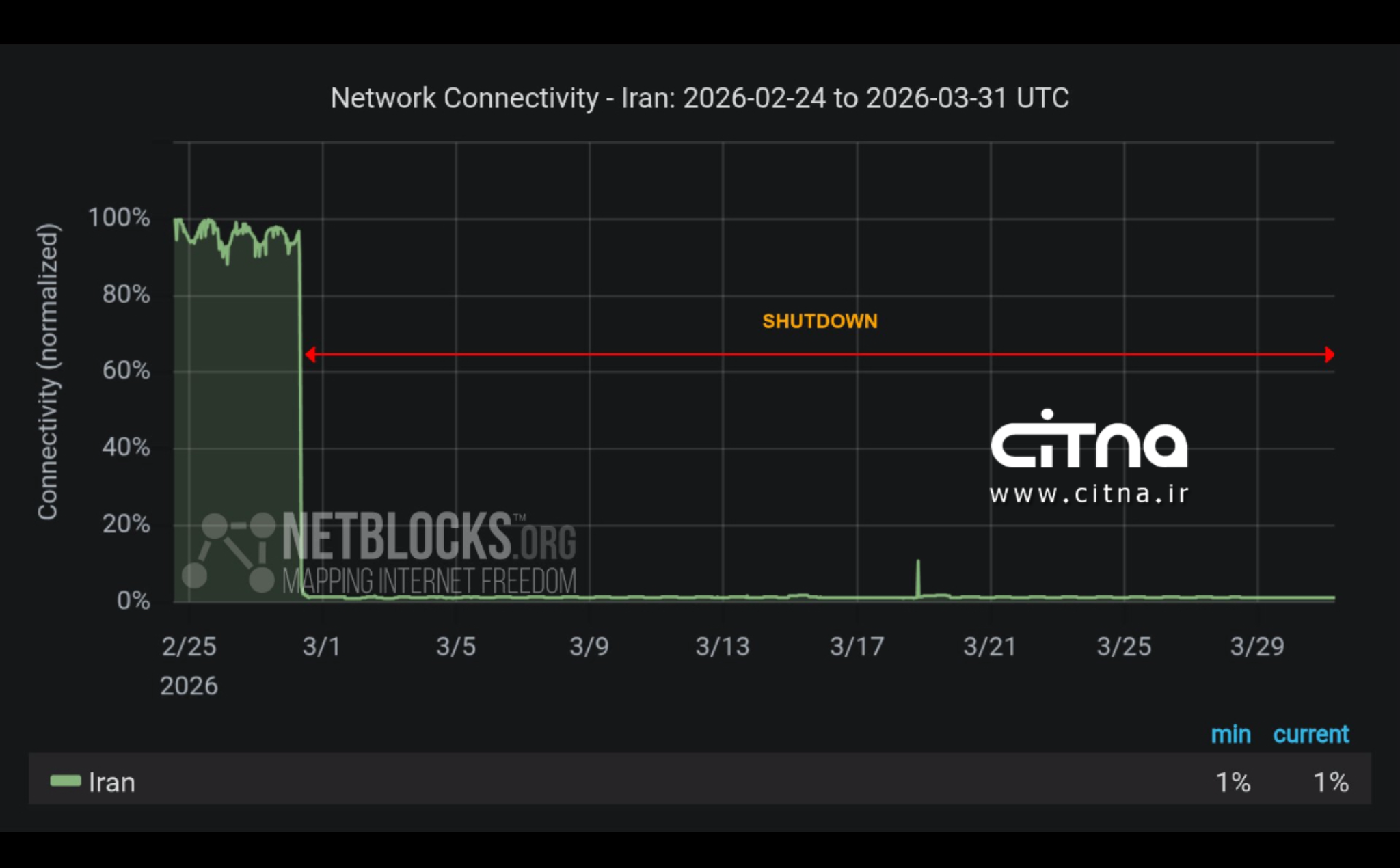 بر اساس جدیدترین گزارش نتبلاکس، قطع اینترنت در ایران بیش از ۷۶۸ ساعت ادامه داشته و اغلب کاربران همچنان از دسترسی به دنیای خارج محروم اند.