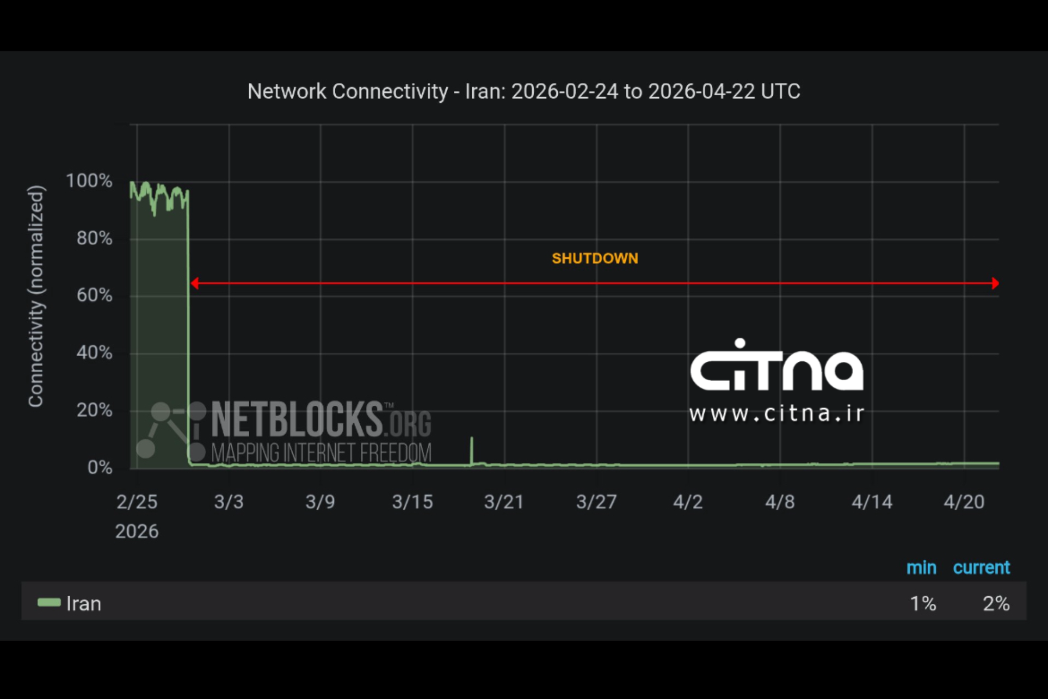 به گزارش سیتنا، داده‌های منتشرشده از سوی نت‌بلاکس نشان می‌دهد ایران اکنون در پنجاه‌وچهارمین روز از یک خاموشی گسترده اینترنتی قرار دارد؛ اختلالی که بیش از ۱۲۷۲ ساعت به طول انجامیده است.