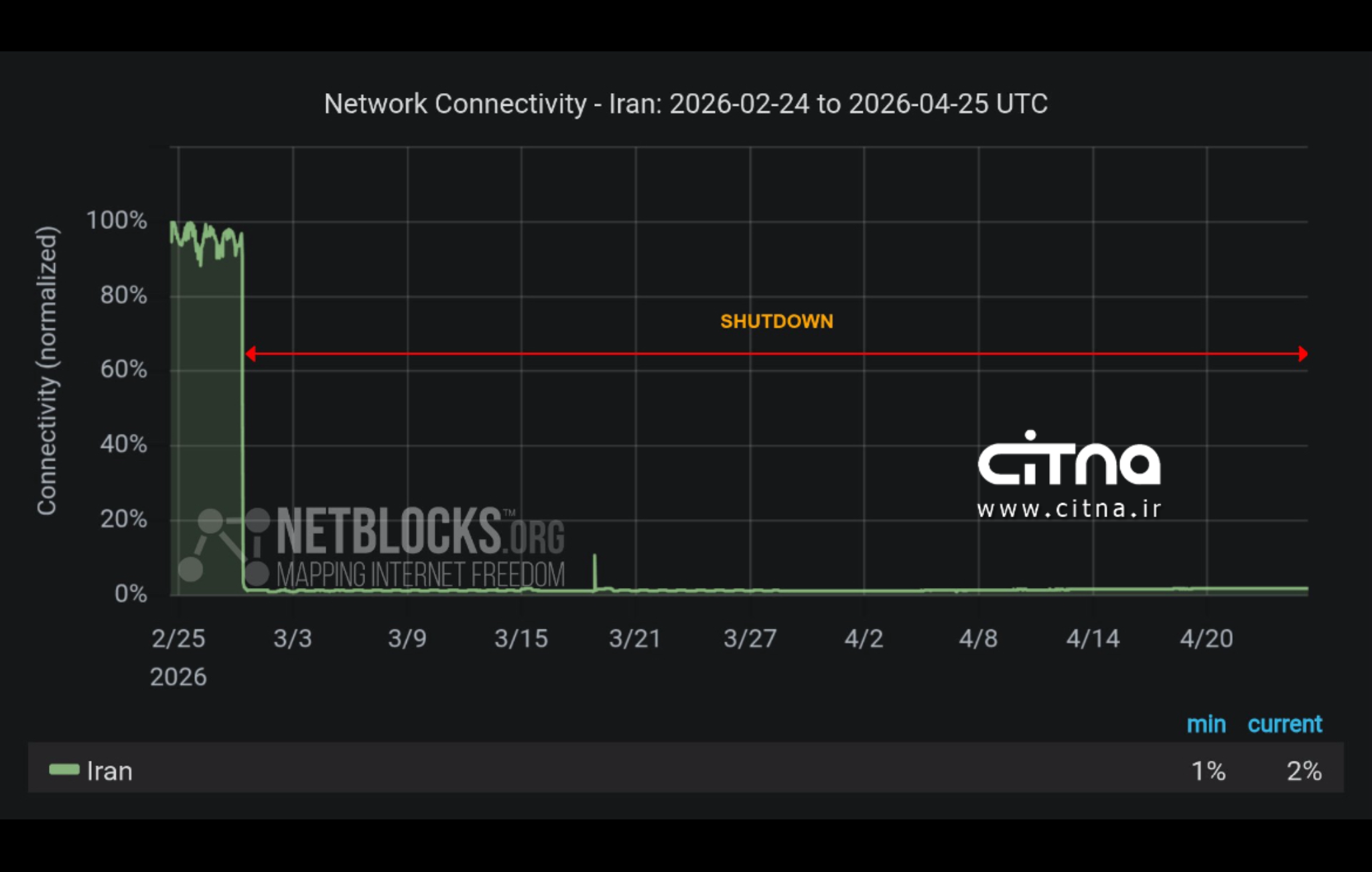 نت بلاکس اعلام کرد که هشت هفته از ۲۸ فوریه که ایران تحت قطعی اینترنت بین الملل قرار گرفت، میگذرد.