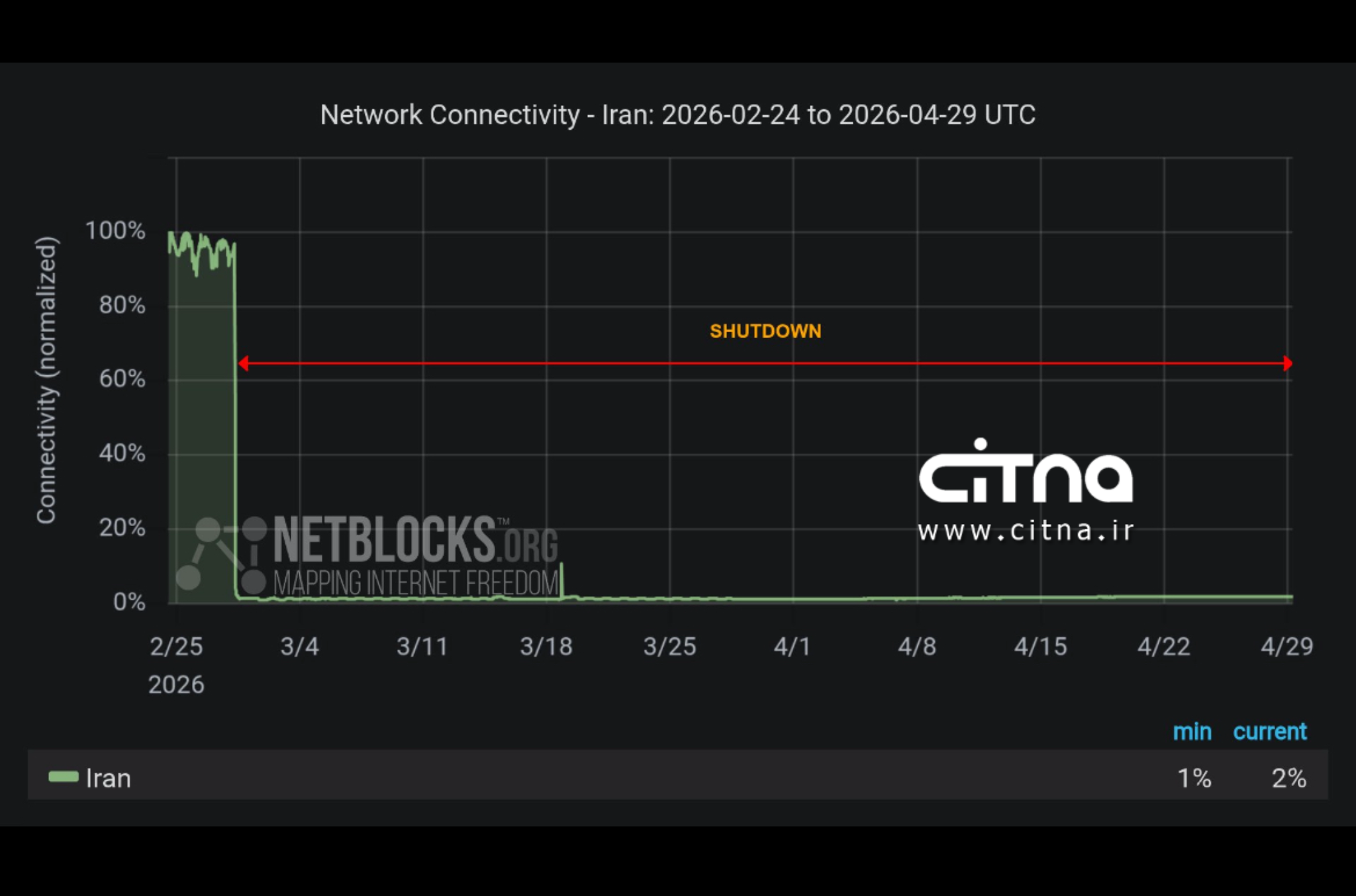 بنابر اعلام نت بلاکس، اکنون شصتویکمین روز خاموشی اینترنت در ایران است و این خاموشی دیجیتال در سطح کشور از ۱۴۴۰ ساعت گذشته است.