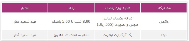 همچنین برای مشترکان دیتا، یک گیگابایت اینترنت رایگان، در نظر گرفته شده است. مشترکان سیم کارت های دیتا می توانند این هدیه را در هر ساعت از شبانه روز تا عید سعید فطر، مصرف نمایند.