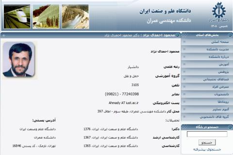 صفحهی دکتر احمدی نژاد در دانشگاه علم و صنعت