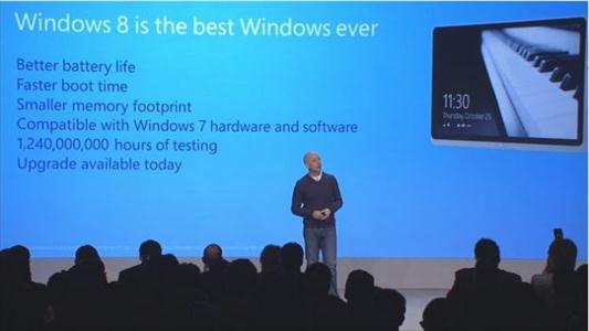 در کنفرانس خبری راه اندازی ویندوز 8 که در نیویورک سیتی برگزار شد، استیون سینوفسکی، رئیس بخش مربوط به ویندوز 8 گفت به محض ارتقا ویندوز خود این تاثیرات را مشاهده می کنید: افزایش 13 درصدی عمر باتری،سریعتر بوت شدن کامپیوتر تا 45 درصد و میزان کمتر درگیری حافظه. فقط افزایش کارایی و عملکرد دستگاه به اندازه کافی اغوا کننده هست که بتواند شما را مجبور به یادگیری حرکات لمسی اینترفیس جدید این ویندوز نماید. بنابراین اگر به دنبال انگیزه خوبی برای ارتقای ویندوزتان می گردید همین ها کفایت می کند.