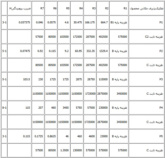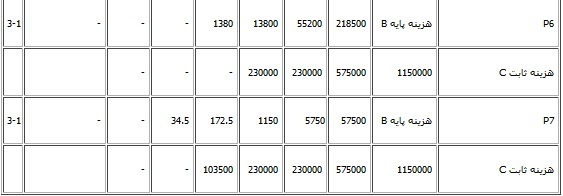 بر مبنای تعریف و اصطلاحات بخش اول، در جدول تعرفهها هزینههای پایه، ضریب پیچیدگی و هزینه ثابت محصولات مختلف به ازای تفکیکپذیریهای مکانی مختلف آمدهاست.