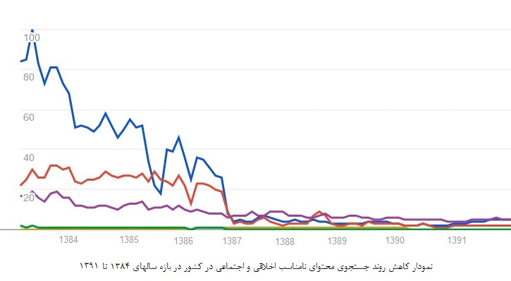با داده کاوی و بررسی بر روی تعدادی از واژه های رایج فارسی مورد استفاده در دایره لغات مورد جستجوی کاربران بر مبنای منابع آماری بین لمللی در بازه سالهای 84 تا 91 به نتایج جالب توجهی دست یافتیم که با توجه به سیاستهای فرهنگی نظام در سالهای بعد از 1384 به این سو حاکی از کاهش تقاضای محتوای غیر اخلاقی از سوی کاربران داخلی و سوق پیدا کردن علاقمندی کاربران به سمت جستجوی محتوای ارزشی و فرهنگی شده ایم.