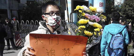 معترضان که اغلب آنها را جوانان تشکیل میداند، در این اقدام اعتراضی در مقابل ساختمان یکی از روزنامههای پرطرفدار این کشور، شاخههای گل و دست نوشتههایی قرار دادند که بر روی آن نوشته شده بود، «مردم چین آزادی میخواهند».