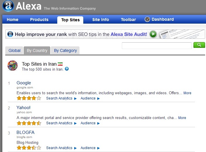 به گزارش سیتنا، مهمترین فاکتور رتبهبندی رسانههای مجازی در سایت الکسا میزان «مخاطبان» یک سایت اینترنتی است که در ایران به ترتیب سایتهای گوگل (www.google.com)، یاهو (www.yahoo.com)، بلاگفا (www.blogfa.com)، ورزش 3 (www.varzesh3.com)، میهن بلاگ (www.mihanblog.com)، پیوندها (www.peyvandha.ir)، پرشین بلاگ (www.persianblog.ir)، خبرگزاری فارس (www.farsnews.com)، ویکیپدیا (www.wikipedia.org) و کلوب دات کام (www.cloob.com) رتبههای اول تا دهم پربازدیدترین سایتهای اینترنتی را دارا میباشند.