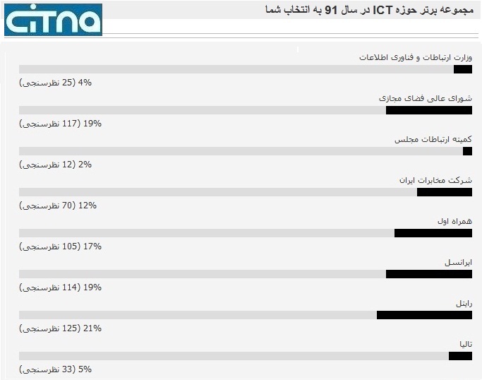 به گزارش سیتنا، در رتبههای بعدی این نظرسنجی به ترتیب شورای عالی فضای مجازی و ایرانسل هر کدام با 19 درصد، همراه اول با 17 درصد، شرکت مخابرات ایران با 12 درصد، تالیا با 5 درصد، وزارت ارتباطات با 4 درصد و کمیته ارتباطات مجلس با 2 درصد قرار گرفتند.