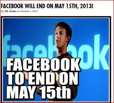 در این گزارش این مجله انگلیسی که بیشتر شبیه طنز است امده فیس بوک با تمام خاطراتش در” ۱۵ می ۲۰۱۳ ” به پایان عمرش خواهد رسید و از فضای مجازی و دسترس کاربرانش خارج خواهد شد!