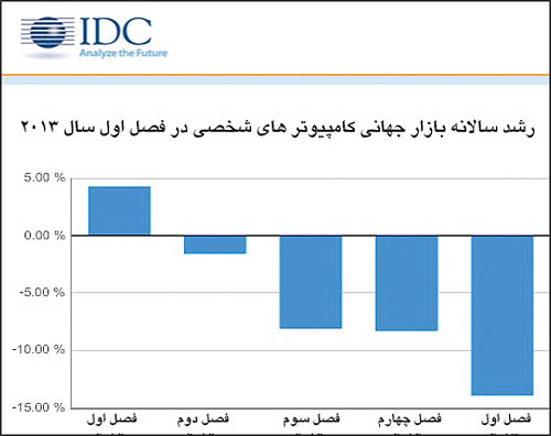 بر اساس این گزارش صادرات جهانی کامپیوترهای شخصی در اولین فصل از سال 2013 بیشترین کاهش در یک فصل را تا حالا به ثبت رسانده و نسبت به فصل اول سال گذشته میلادی کاهش 9/13 درصدی را تجربه کرده است. این در حالی است که کارشناسان این موسسه انتظار داشتند این کاهش در فصل اول امسال حداکثر به 7/7 درصد برسد. در نهایت فصل اول امسال با صادرات 3/76 میلیون دستگاه کامپیوتر شخصی به سرتاسر جهان به پایان رسید تا به این ترتیب بدترین کاهش فصلی برای این بازار از زمان شروع به کار تحقیقات IDC در سال 1994 ثبت شود. البته این نتایج باعث شد تا چهارمین فصل متوالی کاهش رشد سالانه برای این صنعت رقم بخورد.