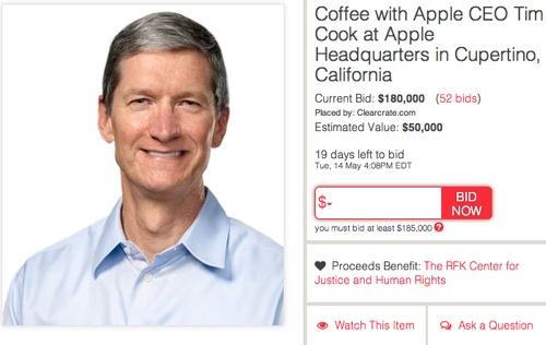 به گزارش سیتنا، مرکز Robert F Kennedy که در زمینه عدالت و حقوق بشر فعالیت می کند به همراه بنیاد خیریه CharityBuzz به تازگی مزایده ای را بر پا کرده است که عواید آن صرف حقوق بشر خواهد شد. در این مزایده شما این فرصت را پیدا می کنید تا دقایقی را در کنار تیم کوک، به نوشیدن قهوه مشغول شوید.