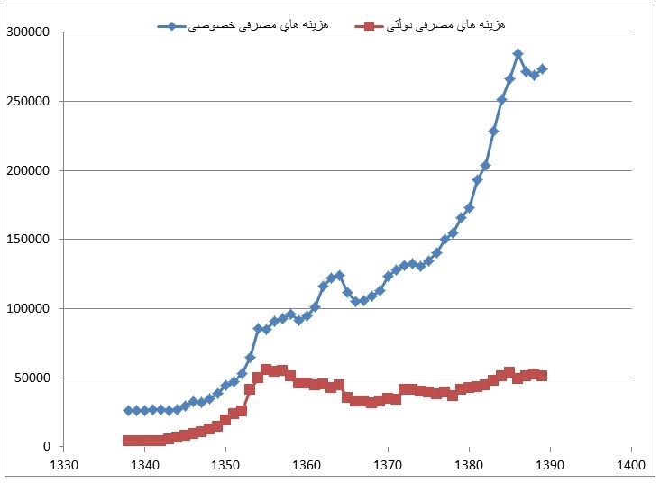 افزایش قیمت نفت در دهه چهل و پنجاه باعث شد که هزینه های مصرفی دولت در سال 55 نسبت به سال 38 بیش از 14 برابر افزایش یابد در حالی که در این دوره هزینه های مصرفی بخش خصوصی تنها سه برابر افزایش یافت. (نمودار2)