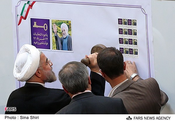 روی این تمبر یادبود عکس «کلید» که نماد انتخاباتی حجتالاسلام روحانی بود، قرار دارد.