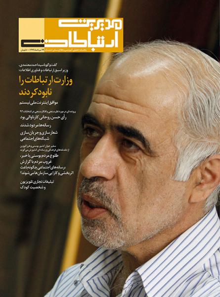 به گزارش سیتنا، مصاحبه ویژه این شماره ماهنامه با سید احمد معتمدی وزیر ارتباطات دوره اصلاحات است که با تیتر وزارت ارتباطات را نابود کردند و همراه با عکس وی بر روی جلد ماهنامه نقش بسته است.