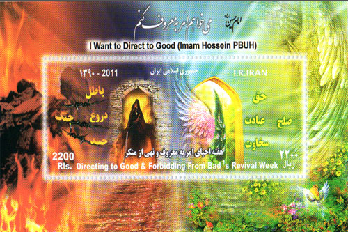 کرباسیان مدیرعامل شرکت پست در سخنانی که در تشریح این تمبر ایراد کرد، با گرامیداشت ایام محرم اظهار داشت: تمبر مذکور به درخواست ستاد احیای امر به معروف و نهی از منکر منتشر شده است. این تمبر از دو بخش بهشت و جهنم تشکیل شده و با سخن زیبای امام حسین (ع) تحت عنوان "میخواهم امر به معروف کنم" مزین گشته و واژههایی که مصادیق معروف و منکر را در بر میگیرد نیز بر روی آن نقش بسته است.