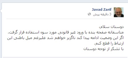در پی ایجاد و سپس هک صفحات برخی مسوولان دولتی در شبکه اجتماعی فیسبوک، ساعاتی پیش، صفحه محمدجواد ظریف وزیر امور خارجه توسط هکر ها مورد حمله قرار گرفت.